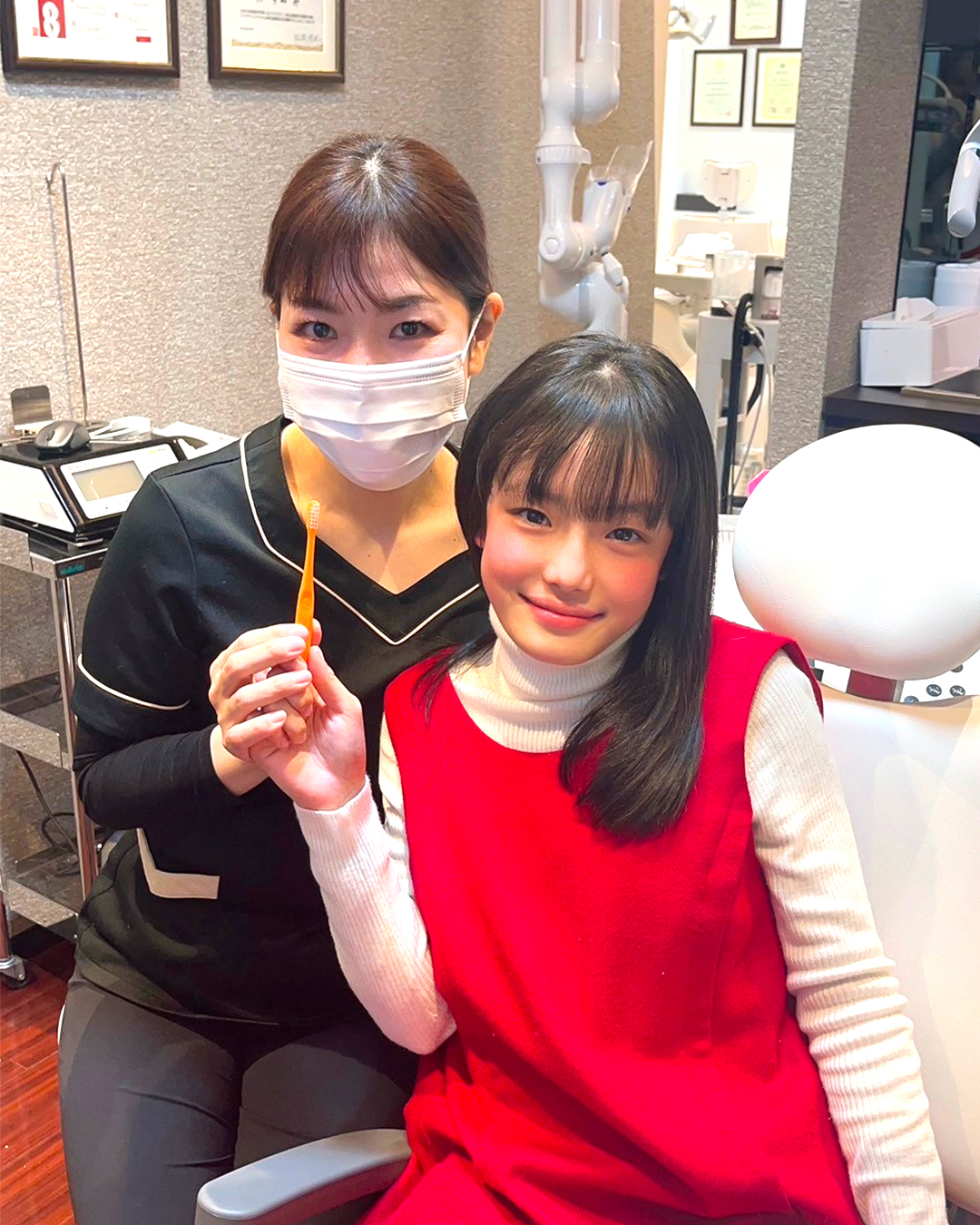 歯磨き指導をするママさん衛生士と娘さんのツーショット。